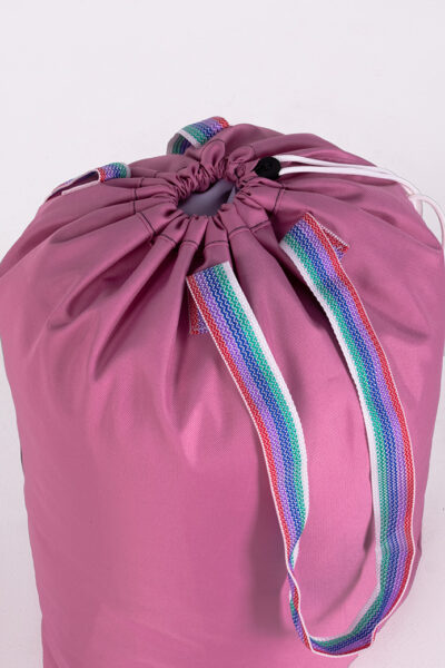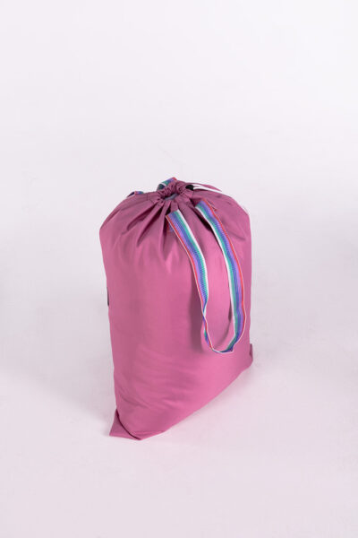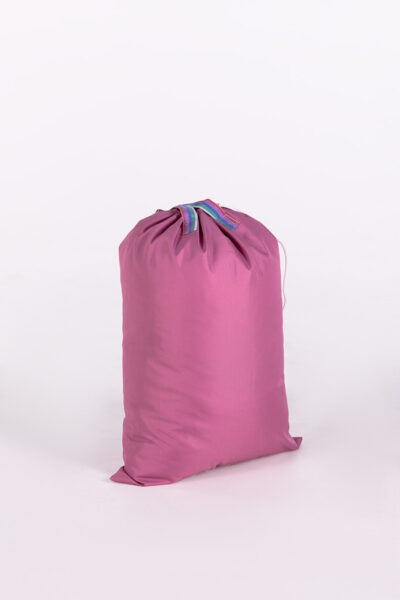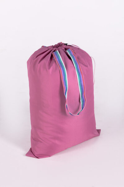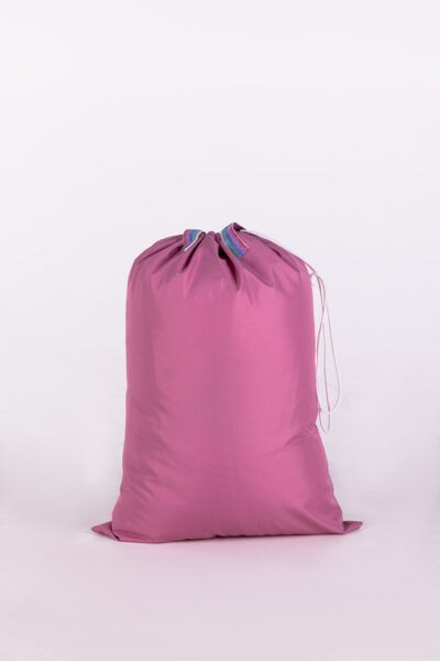 Le sac est de forme rectangulaire et est réalisé de deux parties rectangulaires, cousues ensemble sur trois côtés avec des coutures solides. Ce sac est conçu pour transporter le linge dans les blanchisseries, les hôtels et les hôpitaux, alliant praticité et durabilité.
